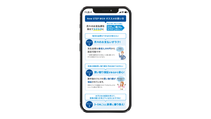 Honda Cars 販売店様のNew STEP WGN 先行予約 ランディングページを制作いたしました。 企画、構成からデザインまで弊社で制作しております。 New STEP WGNの魅力をしっかりと訴求し、新型車への期待感が高まるサイトを心がけました。