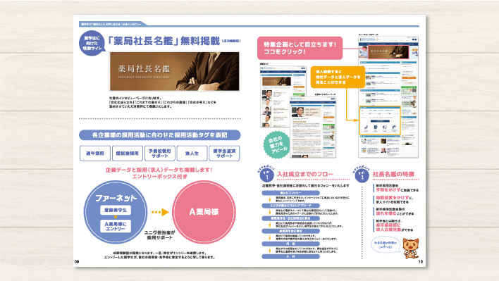 薬剤師/薬学生向け転職就職支援企業様から、薬学生向けの就職支援サービスサイトのパンフレット作成をご依頼いただきました。 サービスサイトの内容が豊富なので、サービスを検討される薬局のご担当者様にサイトの内容がわかりやすく魅力的に伝わるよう心がけました。