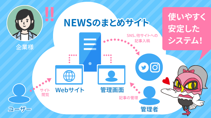 - ニュースサイトに掲載する記事の編集や、外部媒体(※Twitter、LINE、他ニュースサイト等)への入稿などのコンテンツ管理機能を提供