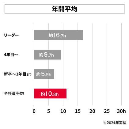 今期の残業年間平均は10.8時間と、昨年とほぼ同様の結果に。毎年平均10時間前後と安定しているのは、業務調整が行えている結果です。